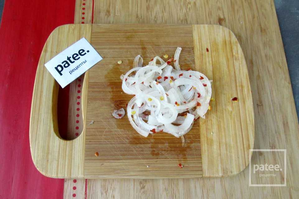 - Лучок режем колечками и замариновываем в смеси воды с уксусом, которая делается в пропорции 2:1 с добавлением сахарка и соли;