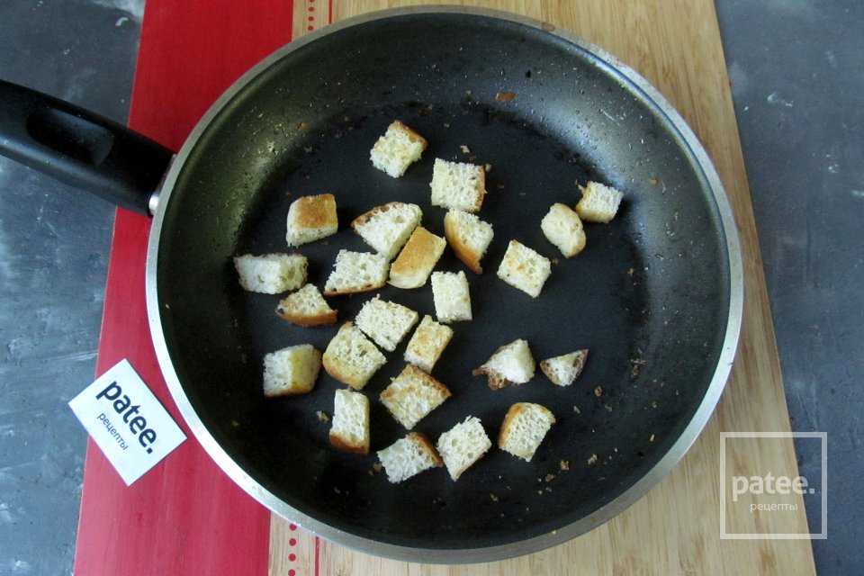 На сковороде, где жарились котлеты, обжариваем хлебные кубики, чтобы получились хрустящие гренки.