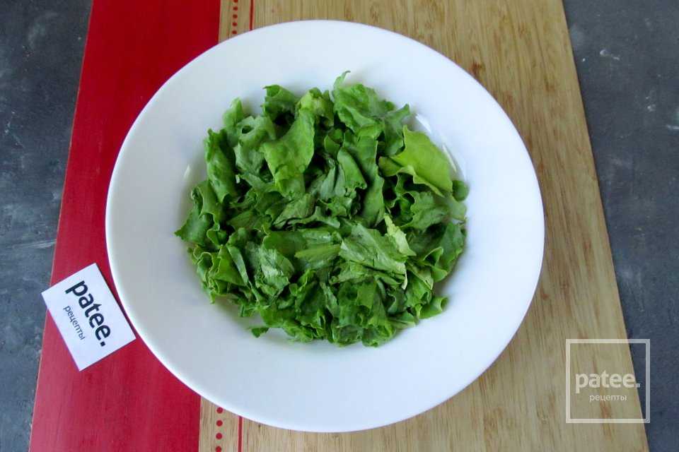 Формируем порции салата. Листья зелёного салата промываем, просушиваем и нарываем руками в две тарелки (будет две порции салата).