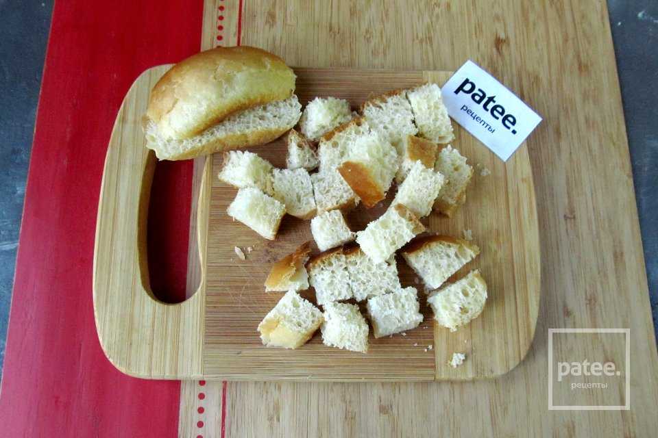 Далее булочку для бургеров нарезаем небольшими кубиками. Вместо булочки можно также взять обычный батон, багет или белый хлеб.