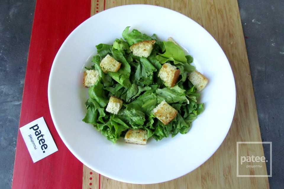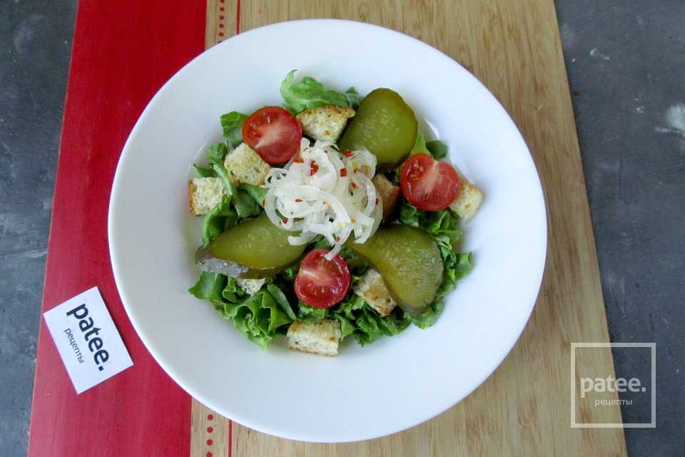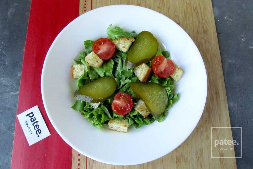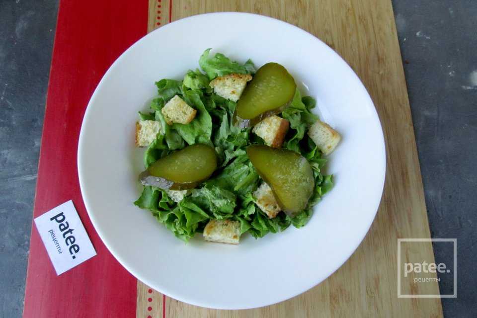 Солёный огурец нарезаем тонкими кружочками и раскладываем на листья салата между гренками.