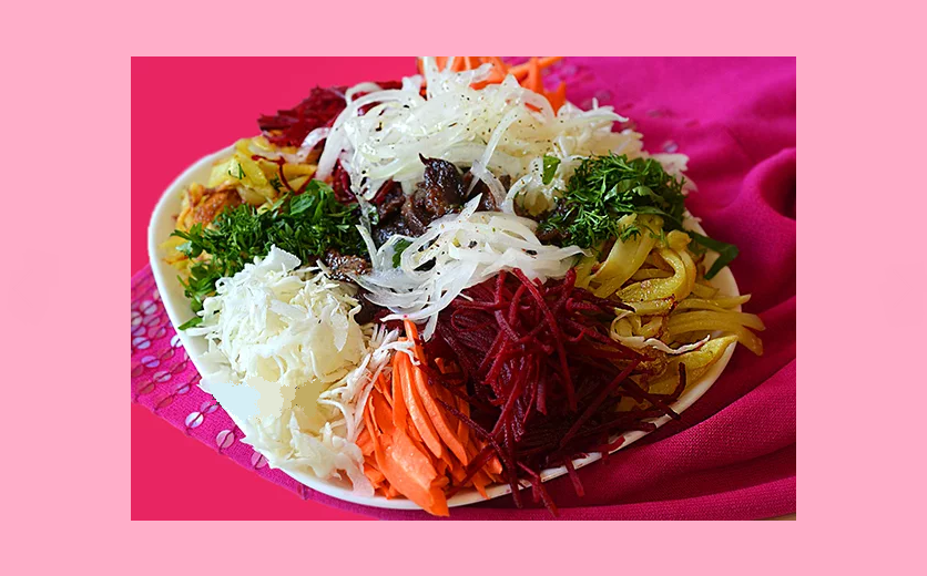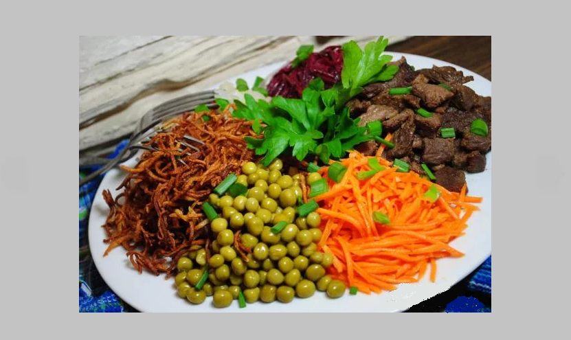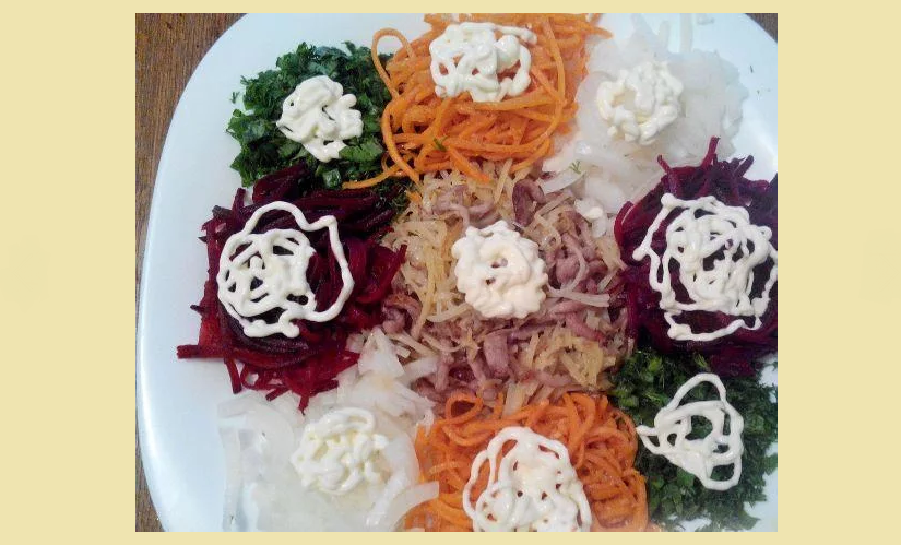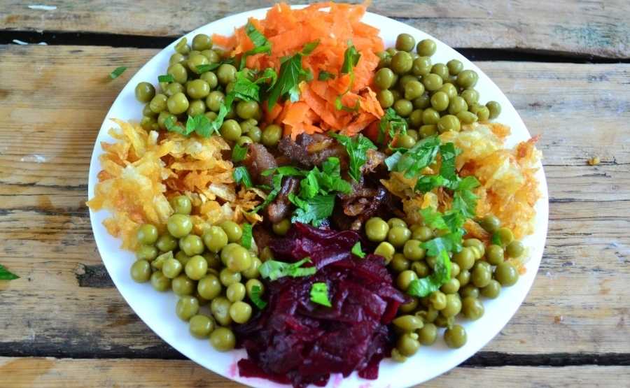 - Выложите продукты на тарелку секторами, чередуя их в следующей последовательности, если двигаться по часовой стрелке: мясо, свекла, картофель, морковь, капуста, маринованный лук.