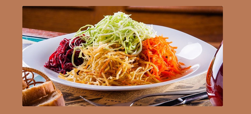 Картошку для этого салата требуется почистить, нарезать соломкой и обжарить во фритюре. Мясо помыть, просушить и также порезать соломкой. Обжарить мясо на сковороде до румяного состояния. Смешать мясо с картошкой и слить лишний жир. Луковицу почистить и нашинковать полукольцами. Залить лук горячей водой и оставить на 20 минут. После этого уйдет горечь и неприятный запах. Свеклу надобно сварить, почистить и натереть на крупной терке.