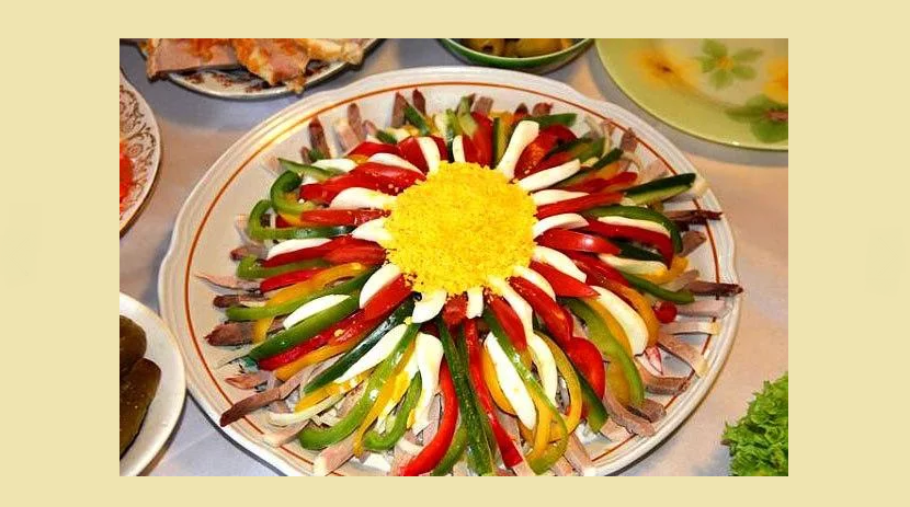 Красивое украшение праздничного салата «Чафан» на 8 Марта