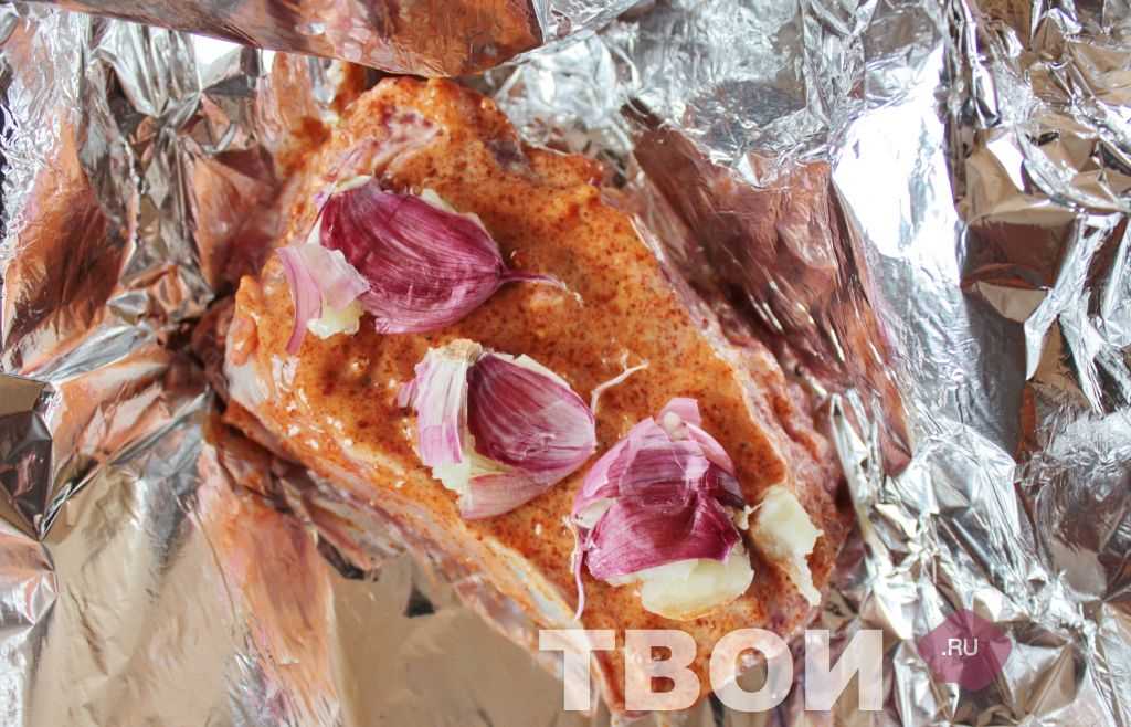 - Достать филе из холодильника, убрать пленку и стряхнуть чеснок. Обжарить мясо с каждой стороны по 2-3 минуты на разогретой сковороде. Масло для жарки не добавлять.
