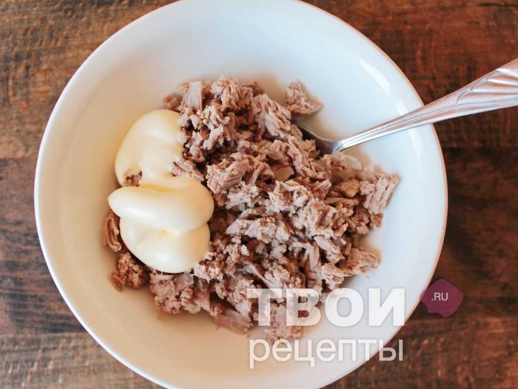 Чуть остывшую телятину мелко порезать и смешать с майонезом.