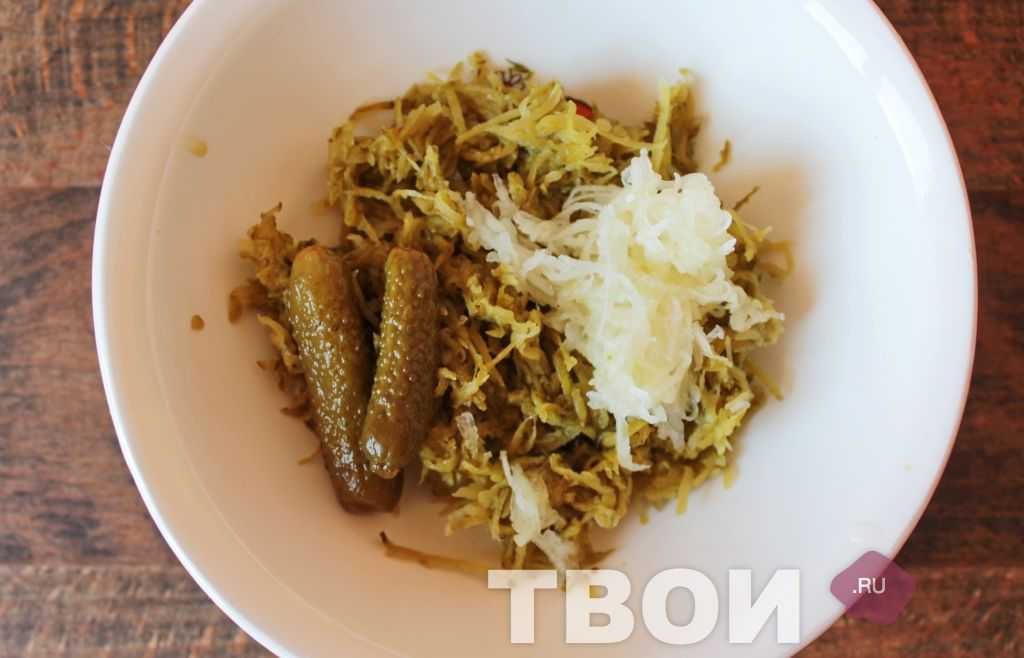Корнишоны с чесноком натереть на средней терке. Если используете соленые или маринованные огурцы, слегка отожмите сок, чтобы салат «не поплыл», и только потом смешайте с чесноком.
