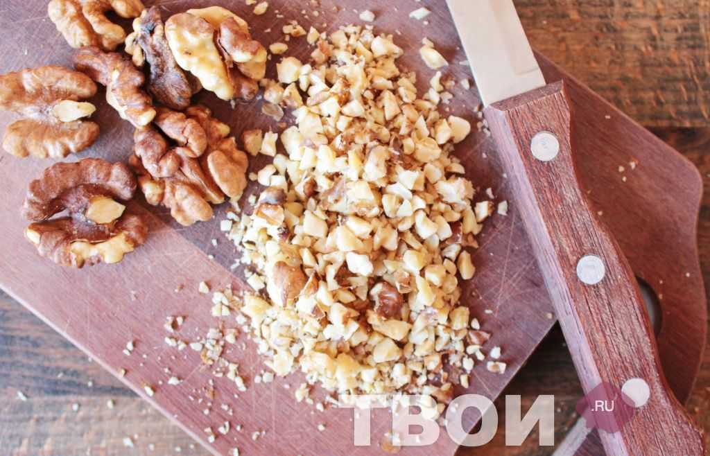 Грецкие орехи подрумянить и мелко порубить ножом.