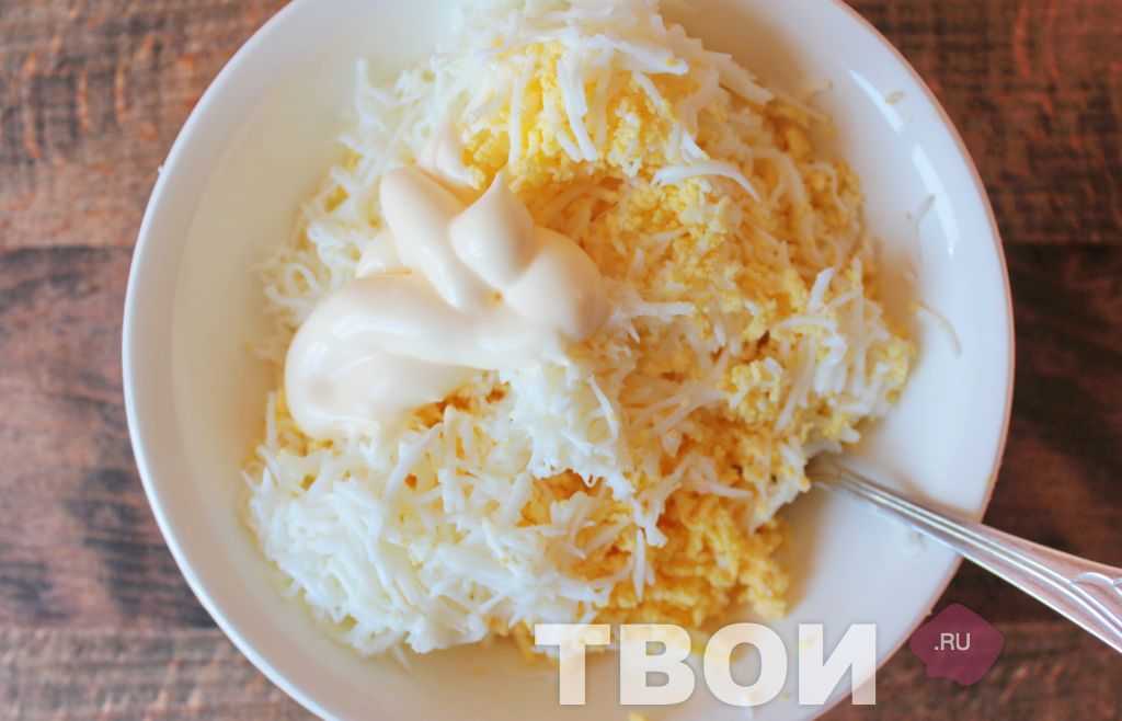 Яйца отварить, натереть на средней терке, заправить майонезом.