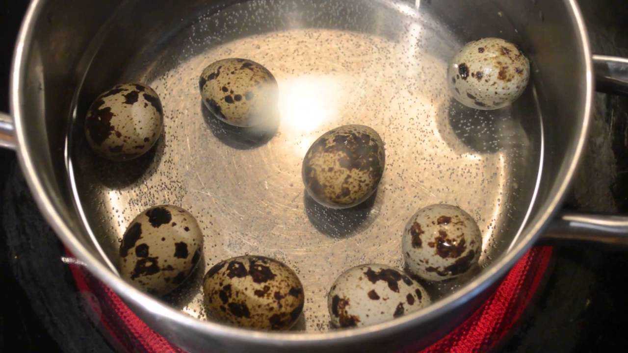 - Поставьте отварить перепелиные яйца. В то же время креветки поместите в кипящую подсоленную воду с 5 горошинами перца и небольшим пучком укропа. Варите их не более 30 секунд, слейте воду, почистите от панциря и кишки. Очистите яйца от кожуры.