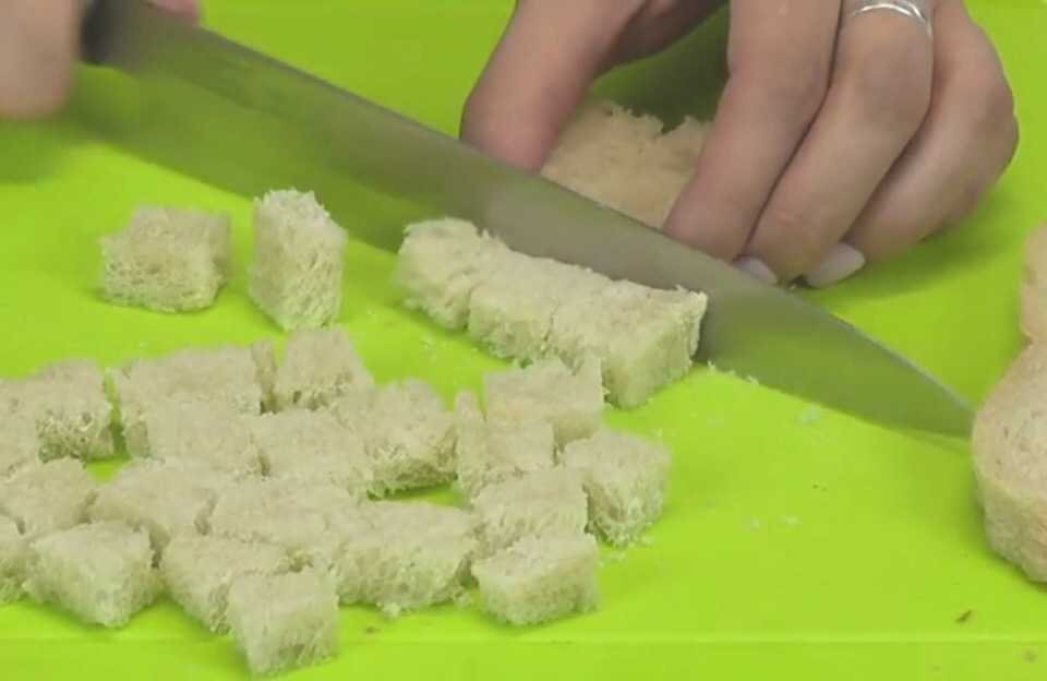 С белого хлеба срежем корочки и нарежем ножом на разделочной доске кубиками 1×1 см. Разогреваем духовку до 180°С, выкладываем кубики хлеба на противень, и ставим на 10 минут в духовку. Периодически открываем духовку и переворачиваем кубики.