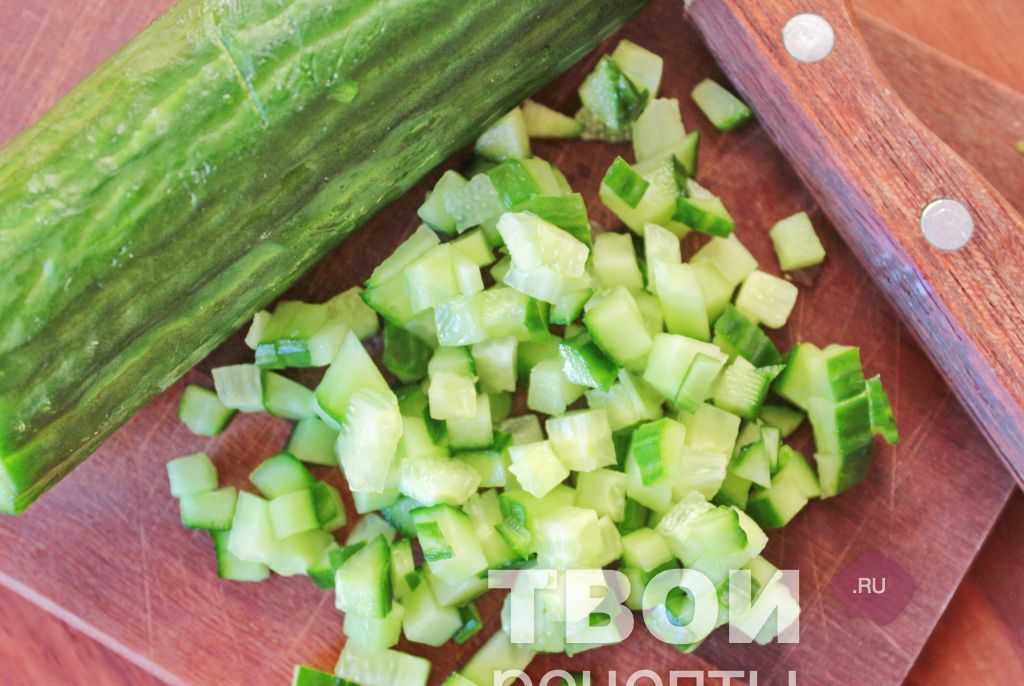 - Огурчики избавить от шкурки и порезать маленькими кубиками.