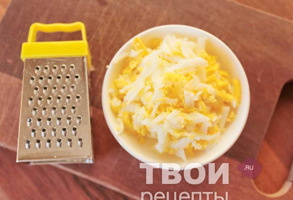 - Яйца отварить, остудить. После очистить от скорлупы и натереть на терке.