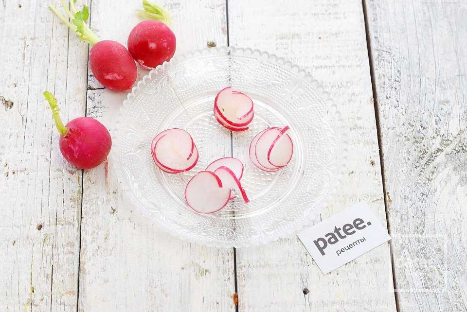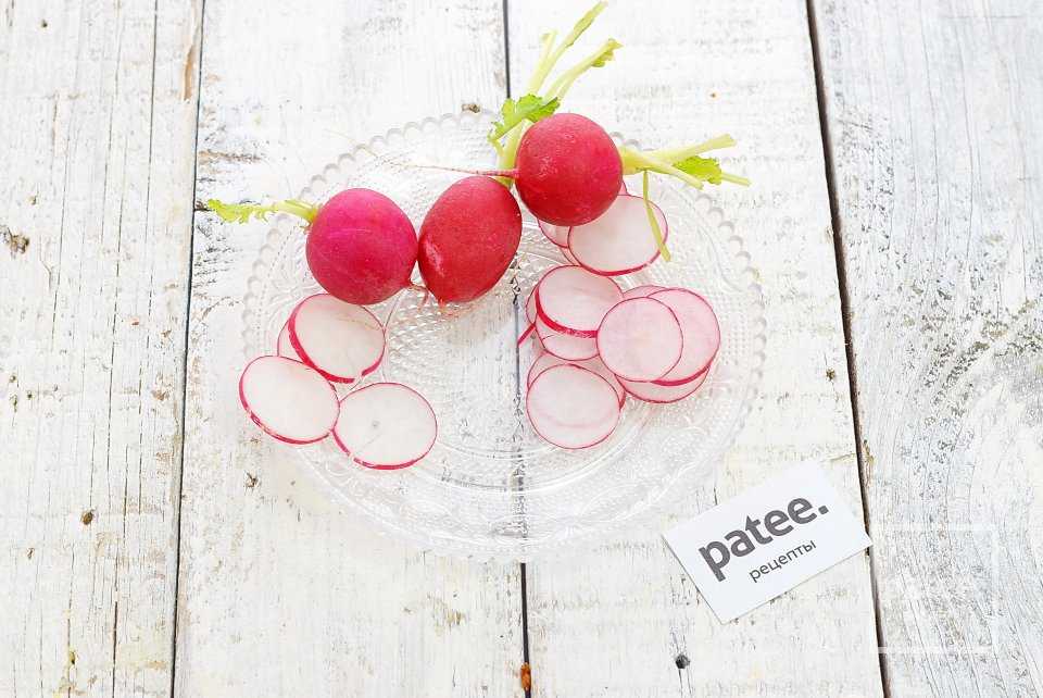 Редиску тоже измельчите, но три штучки оставьте для украшения.