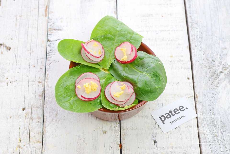 Согласитесь, приятно обнаружить перед собой вот такой красивый выриант салата. Для это не нужно быть очень искусной хозяйкой, простые листья шпината и редис помогут вам в этом. Давайте приготовим такой салат вместе и украсим его празднично и красиво.