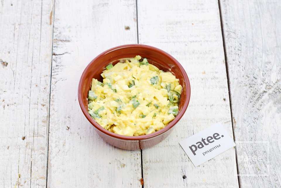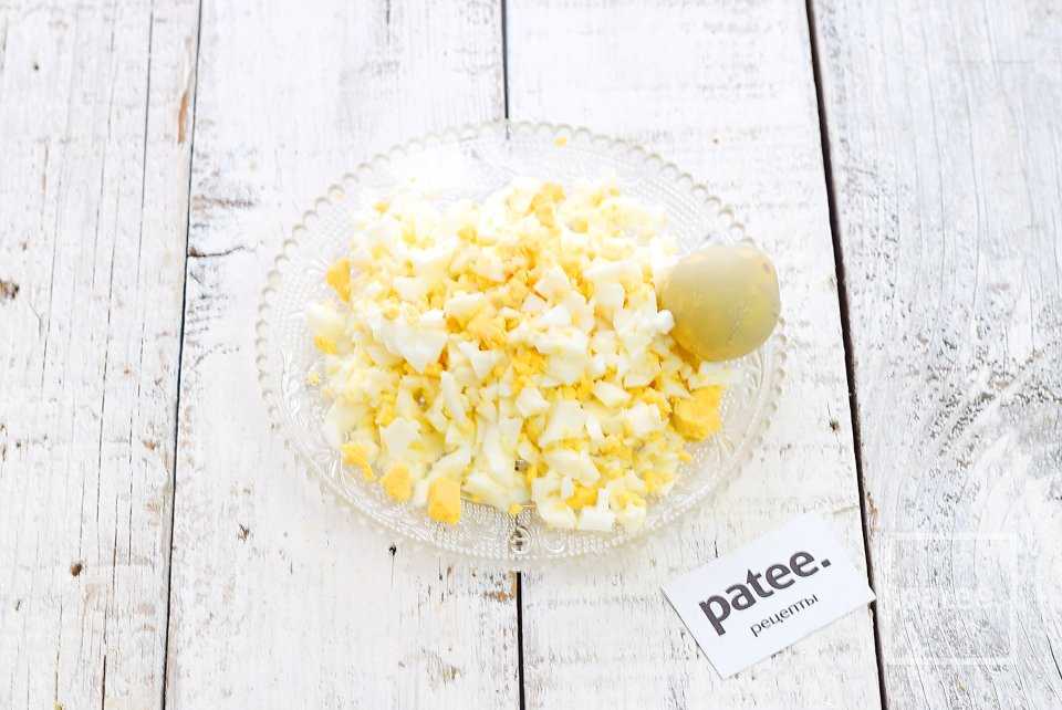 Куриные яйца отвариваем вкрутую, остужаем их. Один желток оставляем для украшения, остальные яйца нарезаем мелким кубиком.