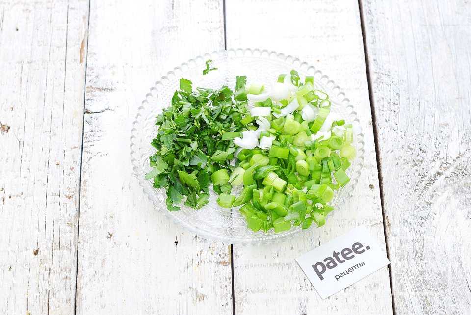 Зелень петрушки и лука моем под проточной водой, обсушиваем бумажным полотенцем и нарезаем очень мелко.