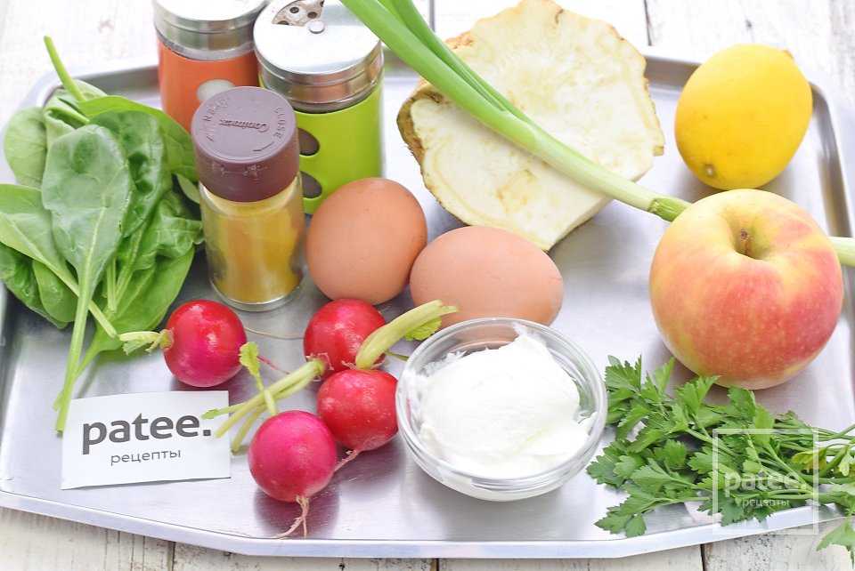 Для приготовления этого салата нам понадобятся такие продукты:редис, шпинат, яблоко, корневой сельдерей, петрушка, зеленый лук, лимон, яйца, сметана, порошок карри, соль, перец.