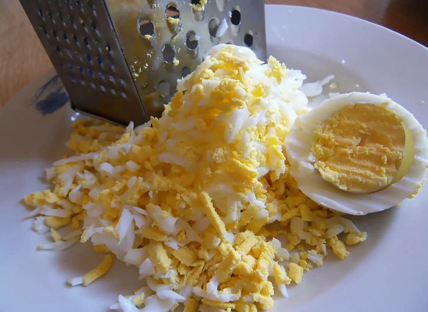 Сыр освобождают от пленки и срезаем парафиновую корочку. Измельчают яйца и сыр на терке с крупными секциями.