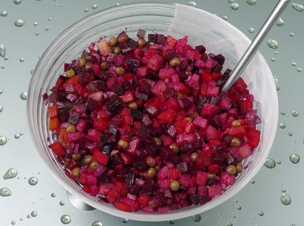 Замечание! В некоторых кулинарных статьях в интернете мне встречался совет добавить к нарезанной свекле растительное масло, чтобы предотвратить окрашивание остальных ингредиентов в красный цвет. К сожалению, как хорошо видно на последних фотографиях винегрета, у меня данная рекомендация не сработала, однако, можете попробовать применить этот совет, вдруг вам удастся добиться чего-то большего?