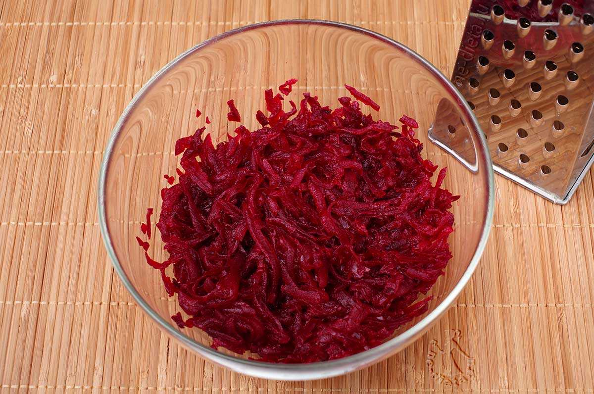 - Далее свеклу потребуется обработать теркой со средними или крупными делениями. Получившаяся овощная стружка отправляется к черносливу.