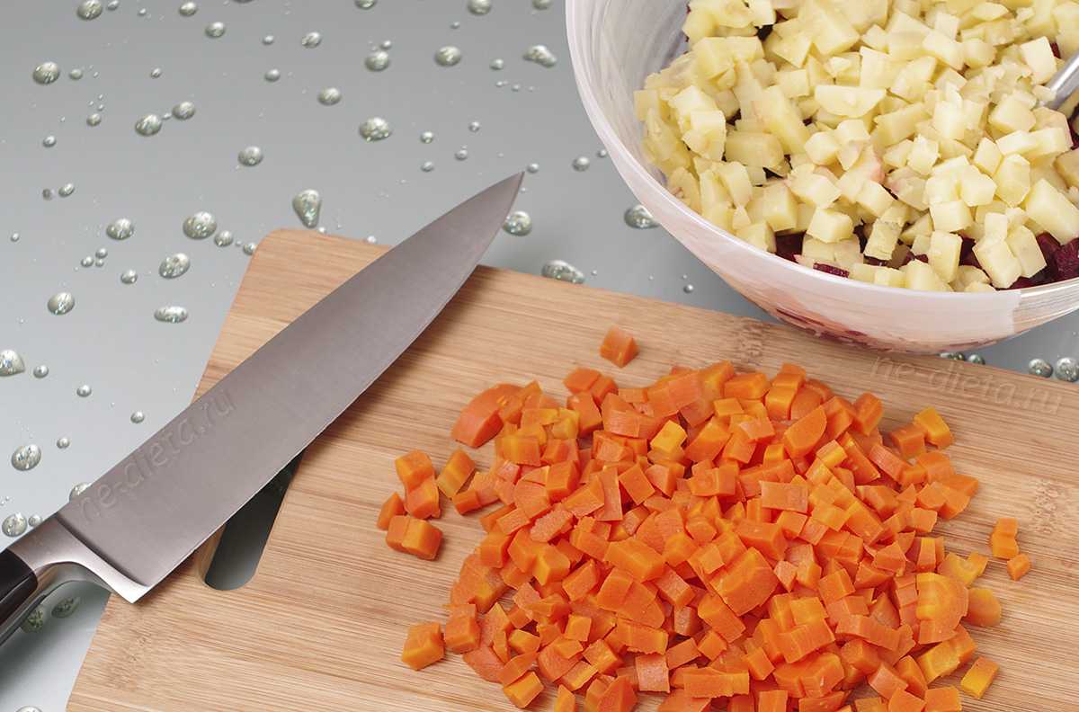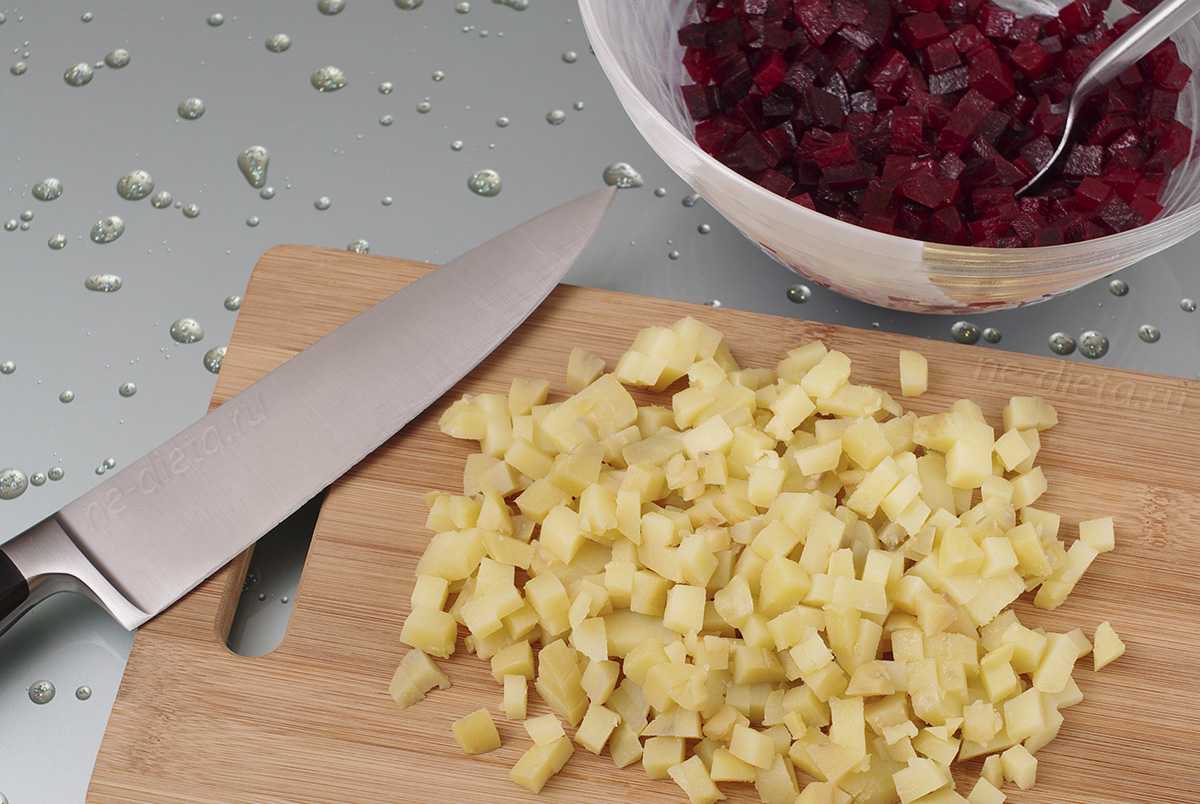 Картошку, морковку, свеклу предварительно нужно отварить. Чтобы овощи проще чистились, положите их сразу после варки в холодную воду. После “холодного душа”, кожура от овощей отойдет легко и просто. Отваренные и очищенные овощи нарезаем мелким кубиком.