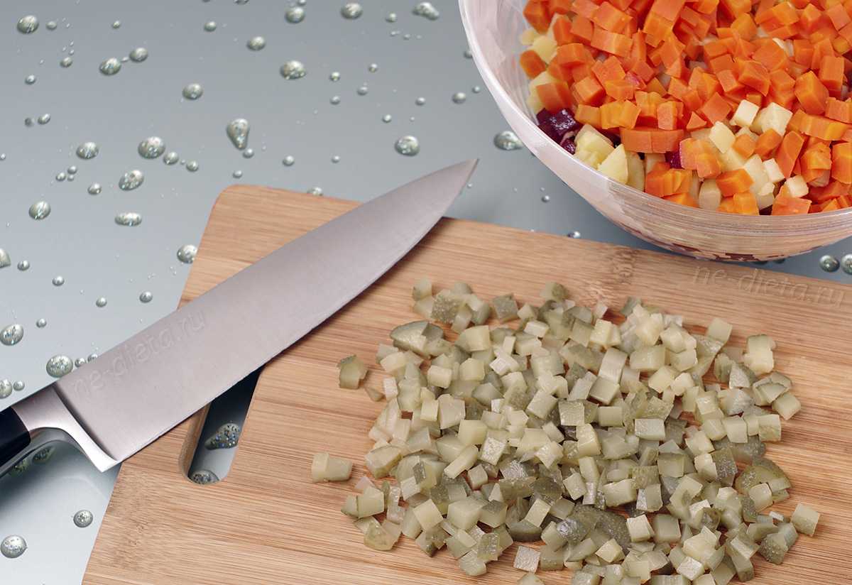 5. Соленые огурцы нарезать кубиками. Если огурцы имеют слишком толстую, грубую или жесткую кожуру, то ее лучше удалить, чтобы консистенция салата оставалась мягкой и нежной.