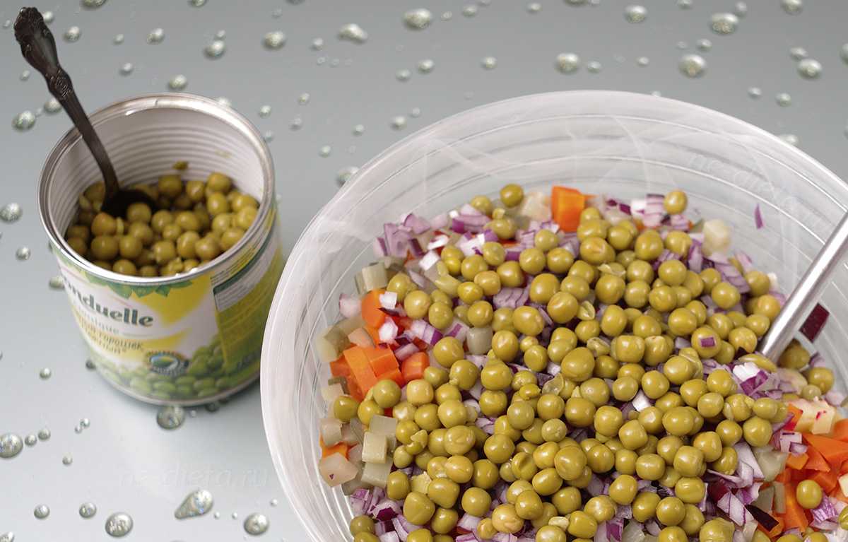 7. Все ингредиенты выложить в большой салатник и добавить к ним консервированный зеленый горошек без жидкости.