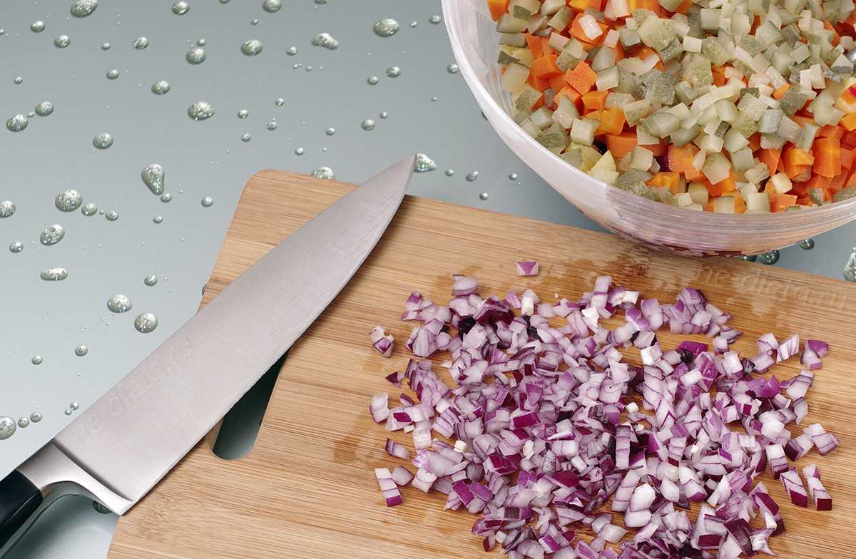 6. Репчатый лук порезать как можно мельче. Я в данном случае взяла красный салатный лук, поскольку он не такой острый и с ним сложно переборщить. При использовании обычного репчатого лука стоит соблюдать меру и класть его с учетом вкусов тех людей, которые будут есть винегрет.
