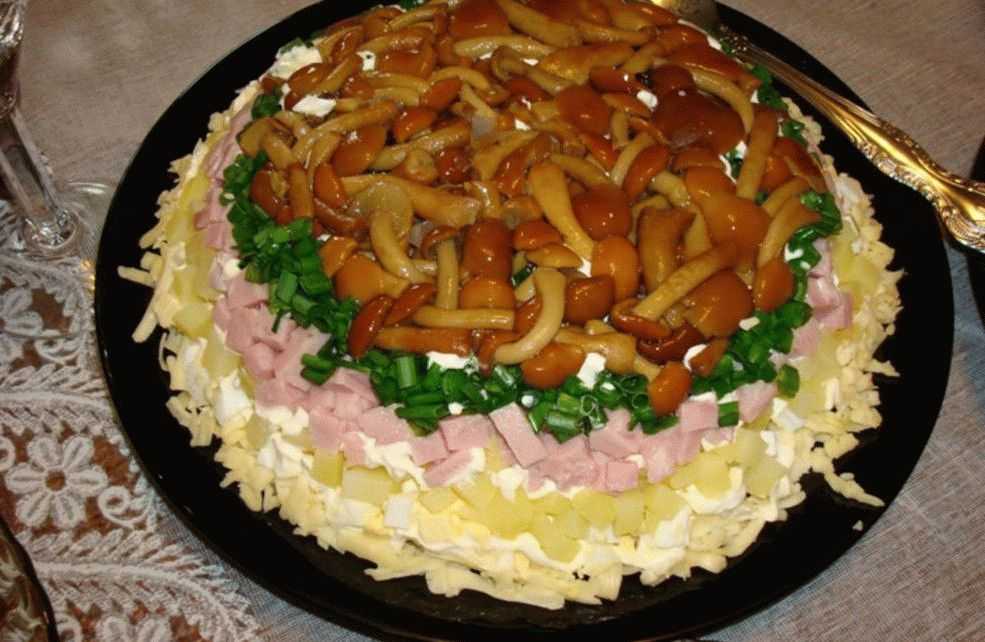 Второй рецепт: салат грибное лукошко с опятами и ветчиной