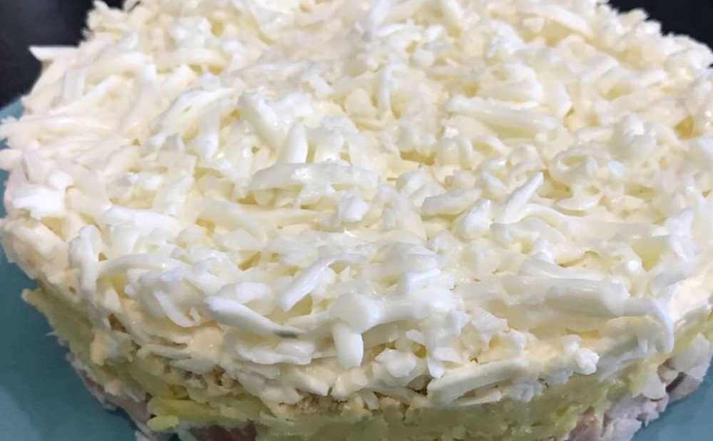 3. Укрыть сеточкой из майонезно-чесночного соуса. Если вы используйте мясо куриной грудки, советуем добавить в этот слой побольше соуса, поскольку оно мясо грудки суховато.