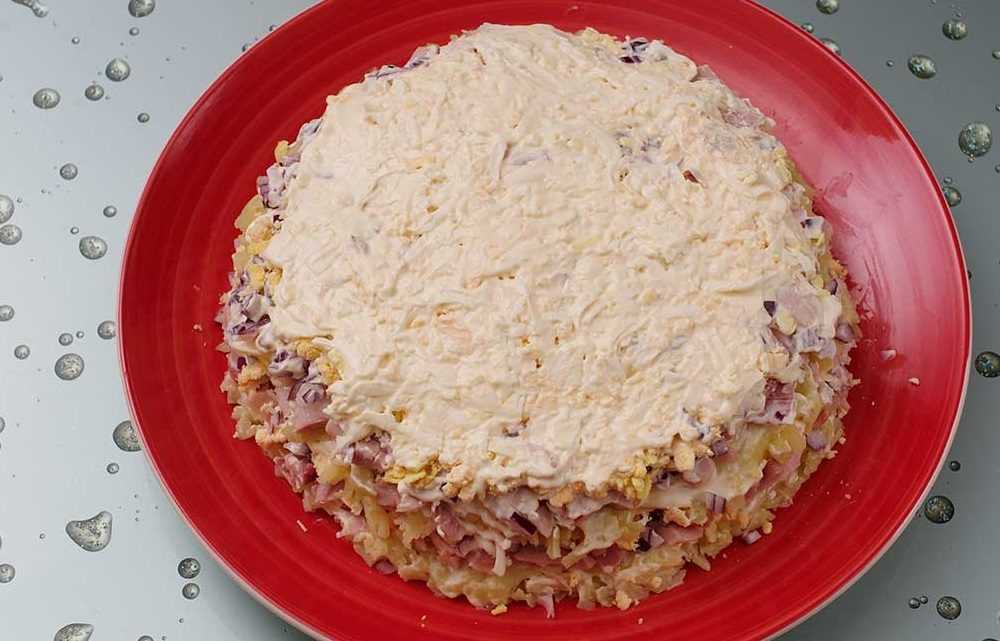 10. Сверху яркий слой тертой свеклы, который нужно намазать майонезом и посыпать обжаренными, раздробленными ядрами грецкого ореха.