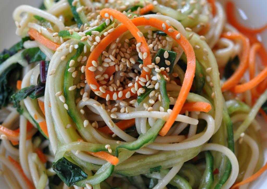 Салат с дошираком, рецепт которого можно дополнить пекинской капустой с морковью, кунжутными семенами и зеленым луком, получается очень сытным, питательным и вкусным. В качестве заправки выступает рисовый уксус с соевым соусом и маслом на основе семян кунжута.