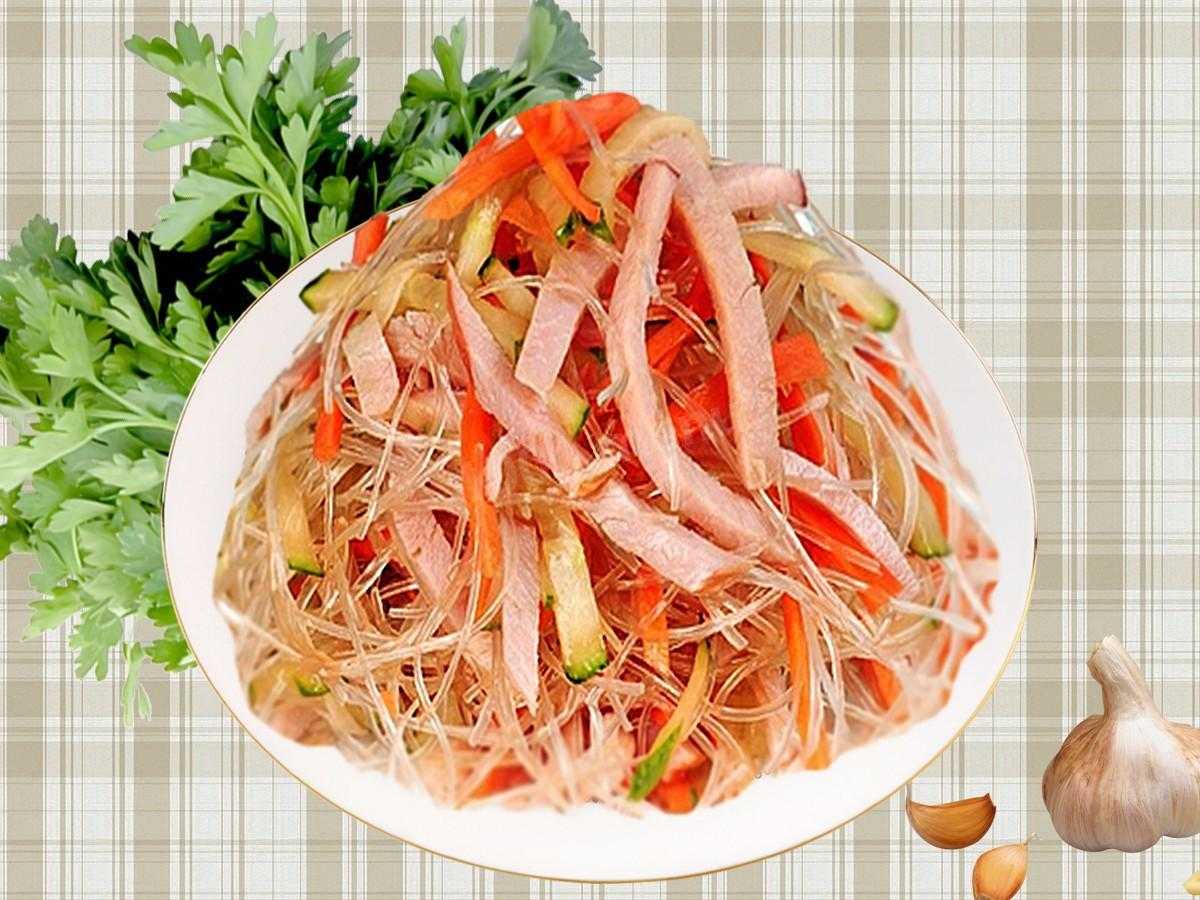 1. Выкладываем крахмальную лапшу в кипящую, подсоленную воду, варим по инструкции на упаковке. Как лапша приготовится, промываем проточной холодной водой, и сливаем лишнюю жидкость. Перекладываем в большое блюдо. 2. Огурцы нарезаем тонкой соломкой и добавляем к лапше. 3. Морковь очищаем и натираем на терке для корейской моркови. Разогреваем сковороду, наливаем растительное масло и обжариваем натертую морковь. 4. В сковороду добавляем ветчину, нарезанную на брусочки, немного обжариваем с морковью и перекладываем в блюдо. 5. Приправляем салат соевым соусом, добавляем измельченный чеснок, соль и перец. Хорошо перемешиваем все ингредиенты.