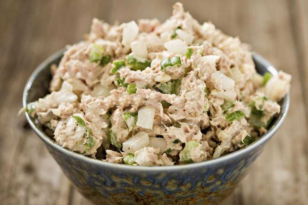 - Кладем на дно салатницы нарезанную кубиками рыбу, сверху выкладываем обжаренный лук, морковку и перемазываем каждый слой майонезом. Сверху украшаем зеленью.