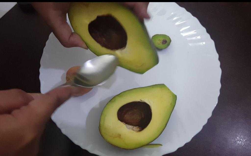 Авокадо разрезать на две половины, аккуратно извлечь косточку. Взять столовую или десертную ложку и аккуратно достать из него большую часть мякоти.