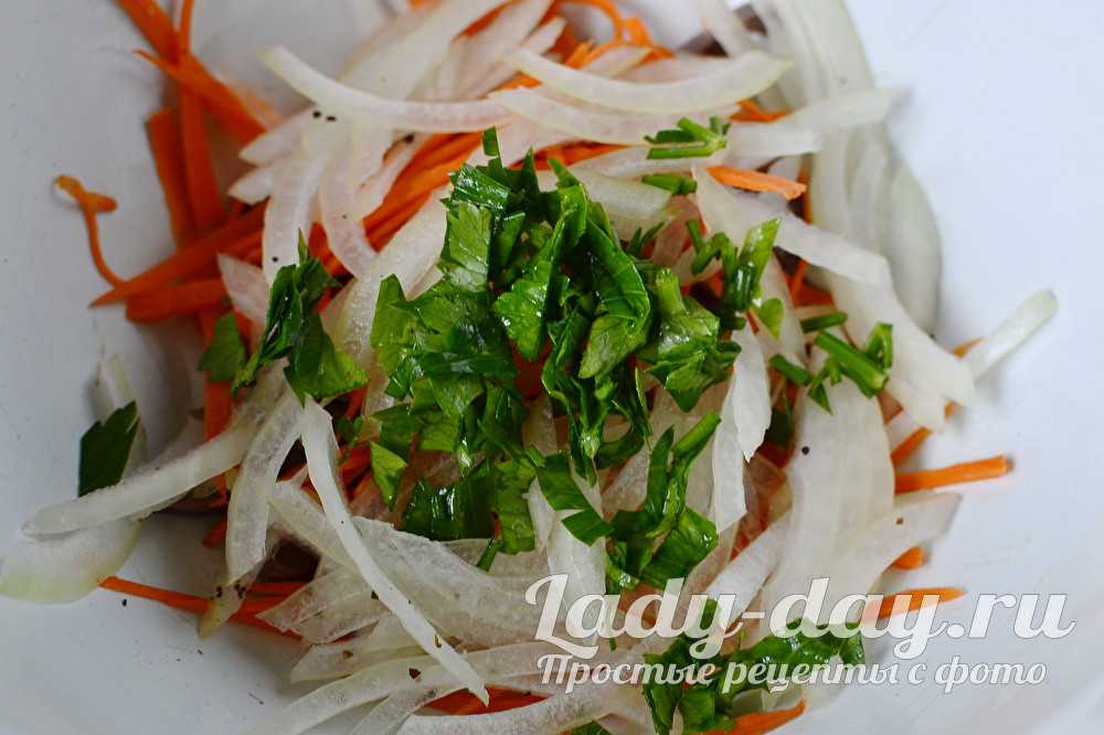В одной миске смешиваем сердце, морковь, маринованный лук и измельченную зелень петрушки.