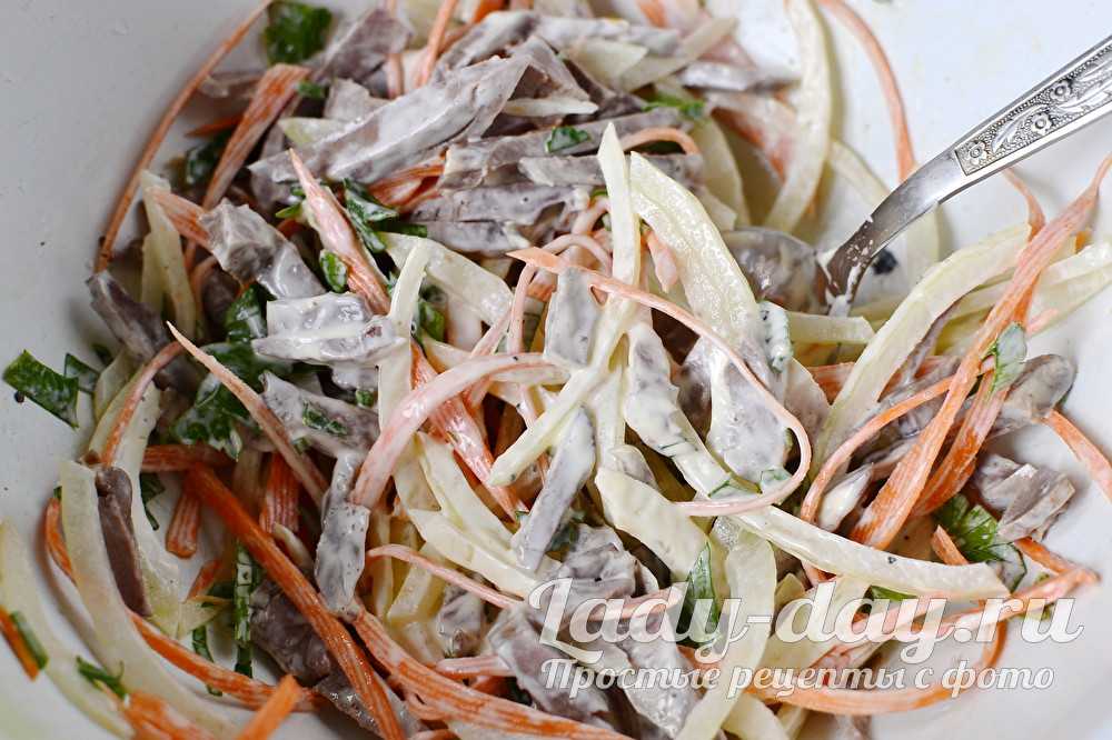 Из свиного сердца получаются особенно вкусные полезные салаты, если добавить к субпродукту овощи.