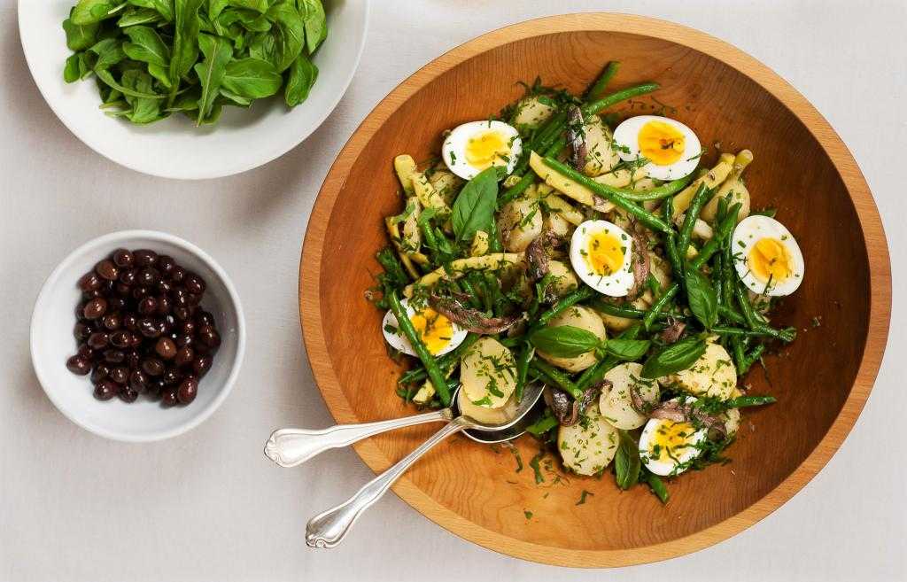 Смешайте заправленные фасоль и картофель, и выложите на блюдо. Посыпьте луком, петрушкой и базиликом и разложите яйца сверху. При желании порежьте сверху анчоусы. Дополните рукколой и выставляйте блюдо на стол.
