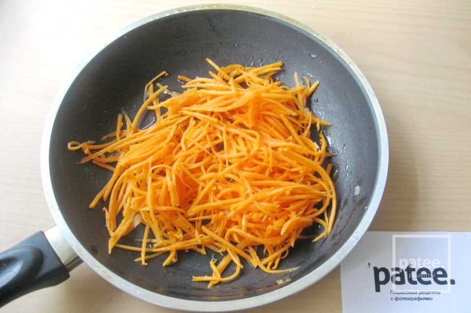 - Пока запекается тыква, припускаем на сковороде нарезанный лук, болгарский перец, морковку и чеснок, а когда они станут мягкими, вводим мясо, солим и перчим продукты.