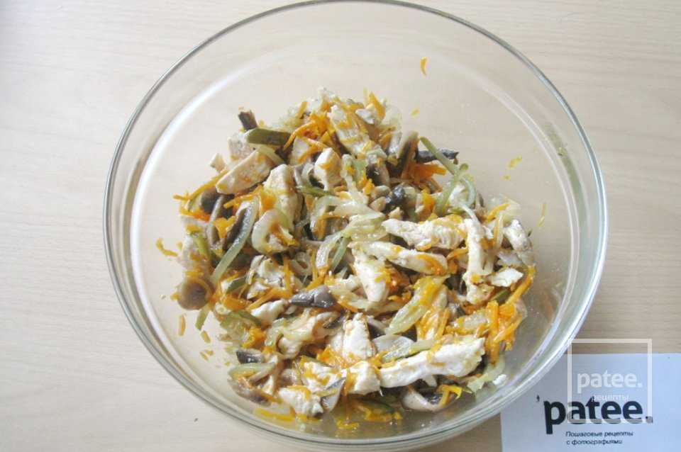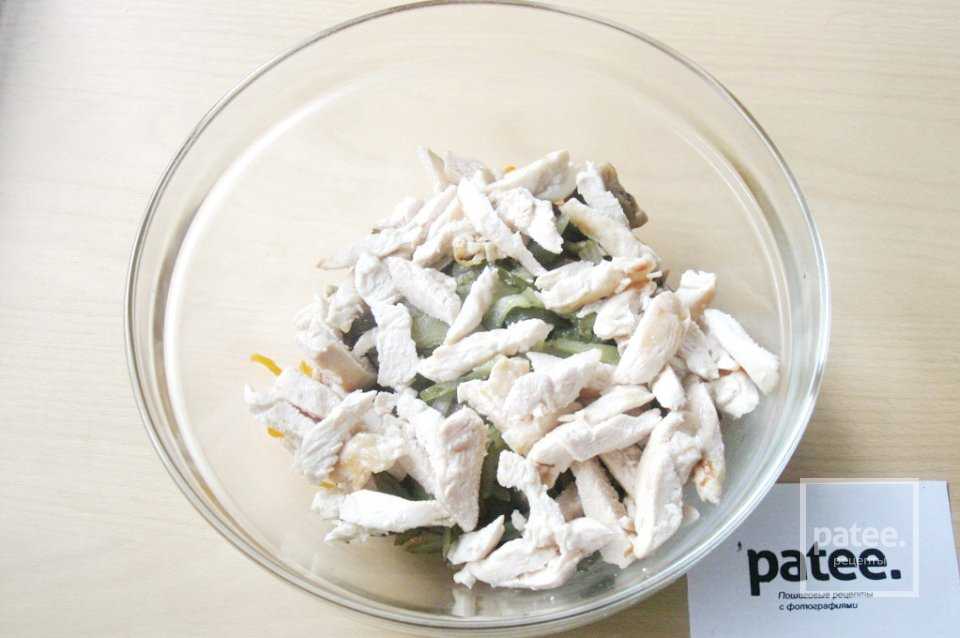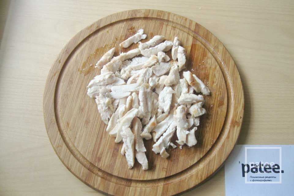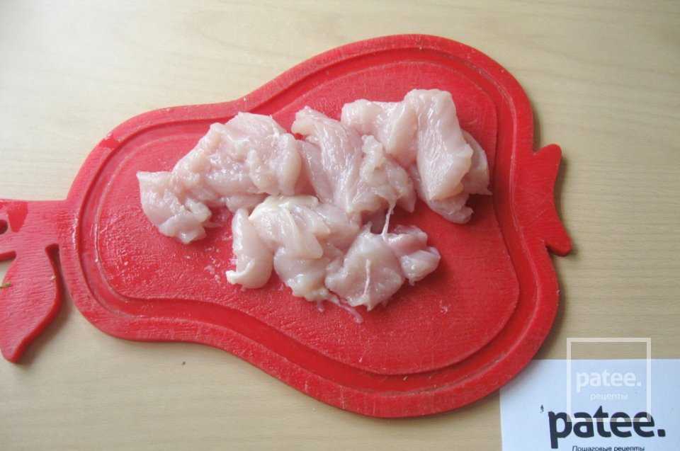 - Режем куриное филе тонкими пластами, натираем солью, приправами и давленым чесноком, оставляем промариноваться.