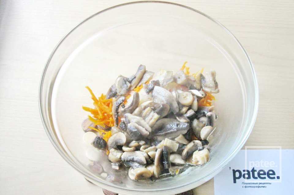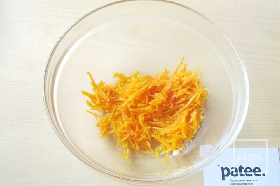 2. Снимите сотейник с огня. Добавьте масло, мёд, соль, перец и перемешайте. Дайте заправке немного остыть. Натрите тыкву на крупной тёрке. Полейте её подготовленной смесью и хорошенько перемешайте.