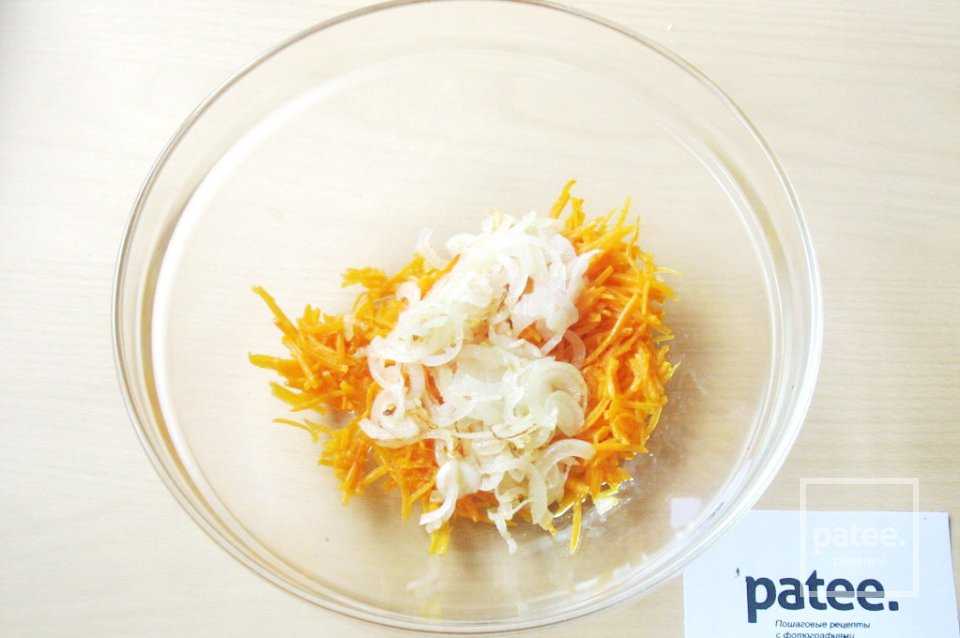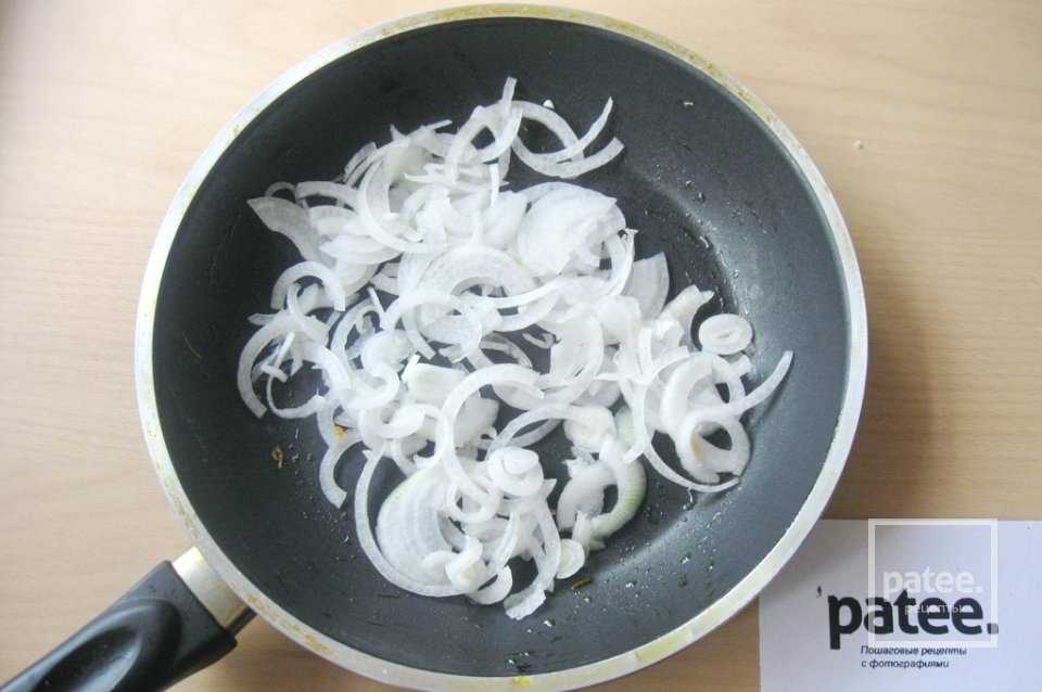 - Очищенную луковицу разрезаем пополам и быстро, без доски, нарезаем нетолстыми дольками. Распределяем лук поверх тыквенно-яблочной массы.
