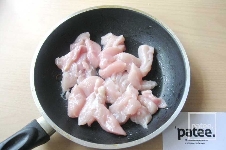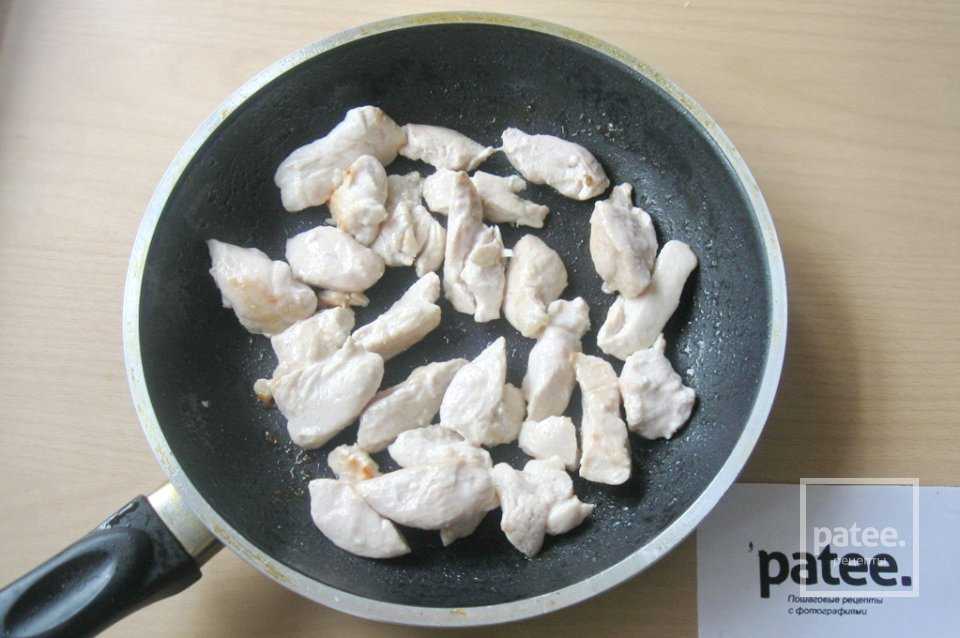 - Филе нарежьте небольшими ломтиками и обжарьте до готовности в оливковом масле.