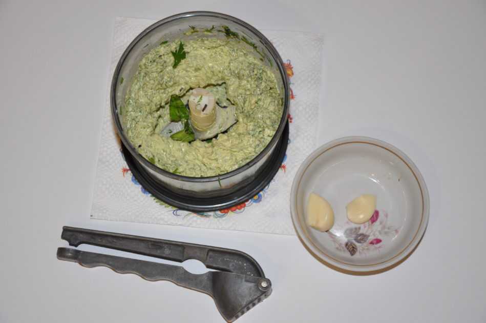 - Далее готовим начинку: чеснок, лук, петрушку измельчить в блендере. Соль и перец добавлять по своим предпочтениям.