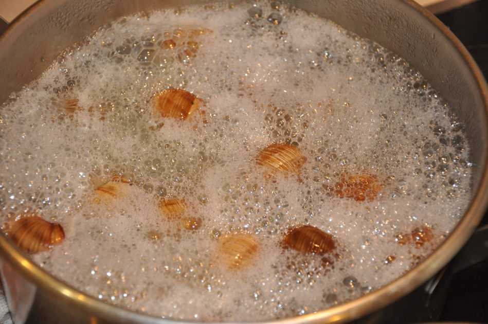 Прежде чем варить моллюсков и извлекать из раковин ценное мясо, необходимо уточнить, что если они были очищены первым способом, то время их нахождения в кипятке будет составлять 1 минуту. Улитки, подготовленные ускоренным методом, варятся до 5 минут. Указанные рекомендации позволят избежать возможного отравления неочищенными моллюсками.