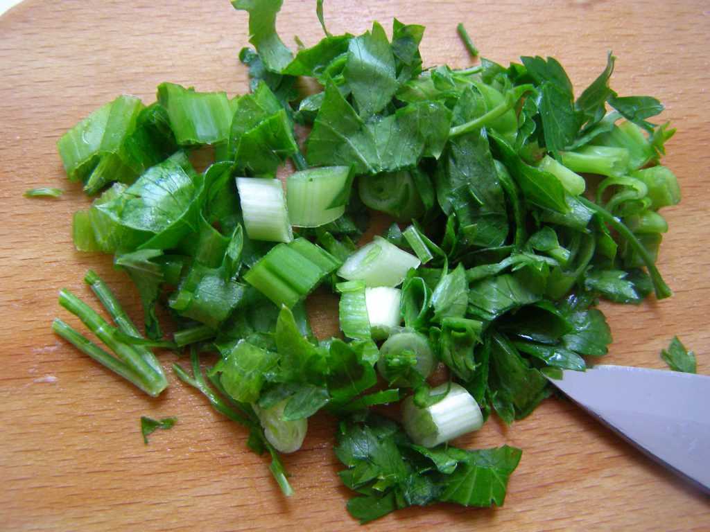 - Зелень промойте, высушите. Мелко нарежьте листья петрушки.