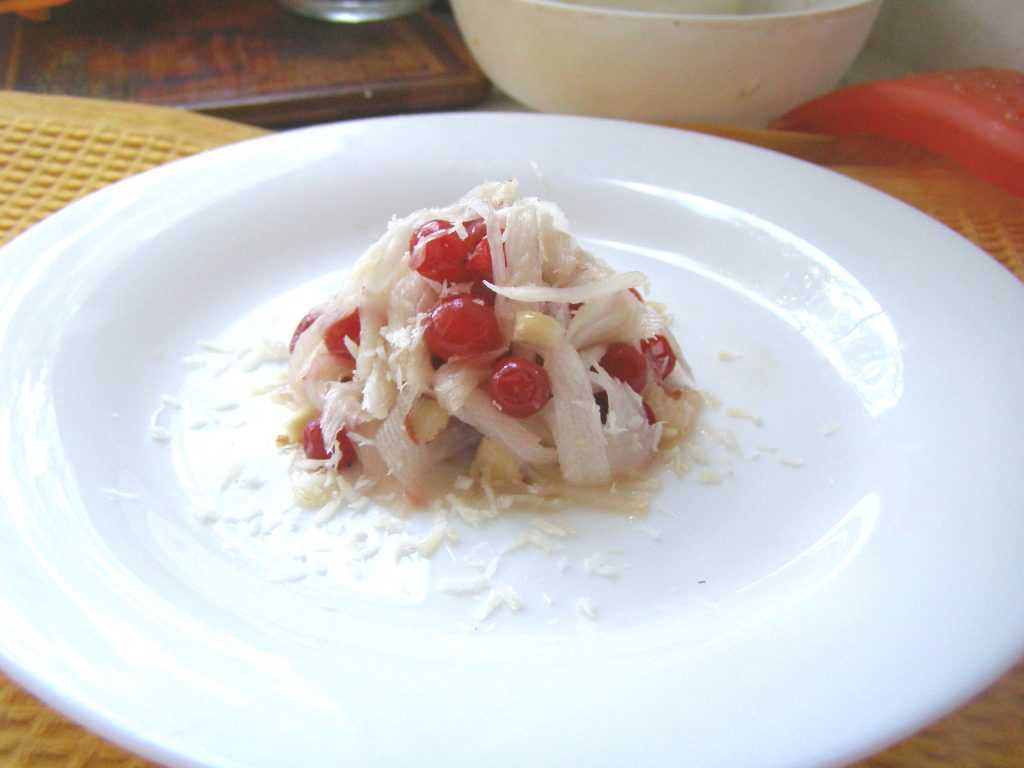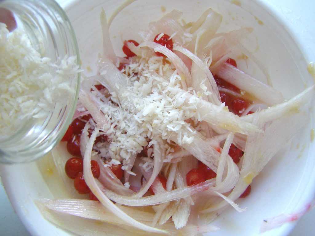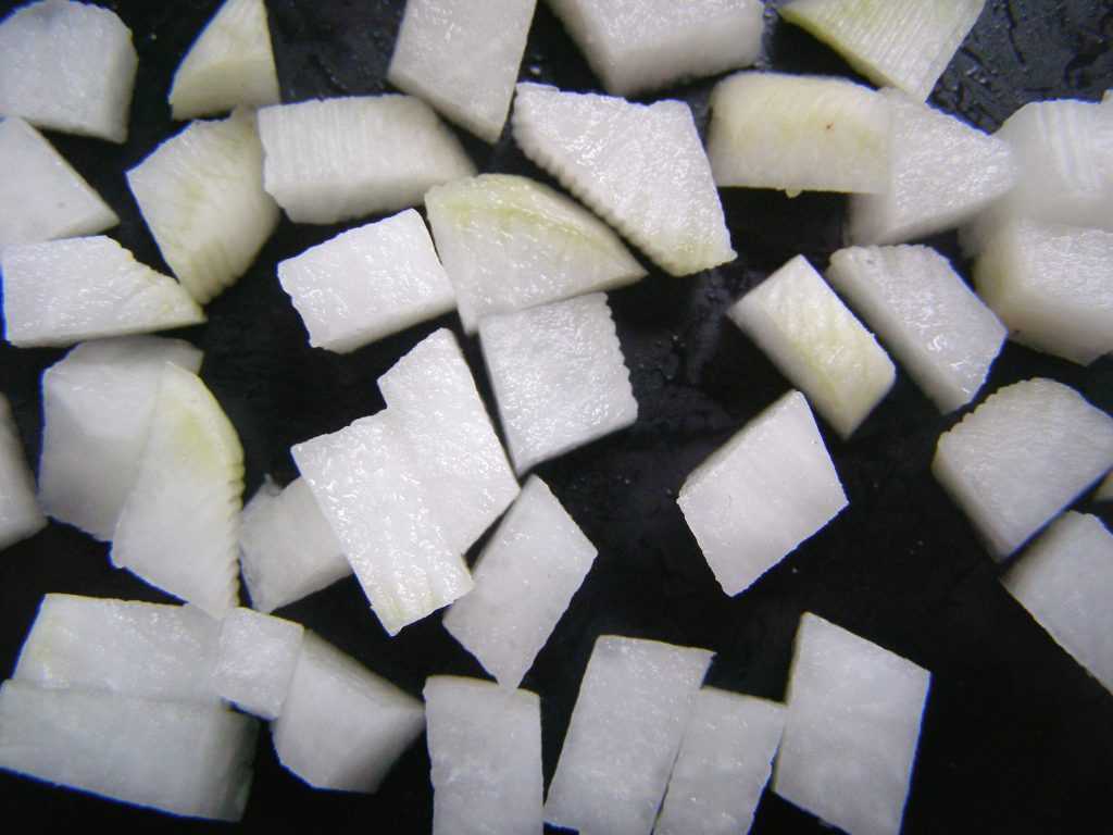 Теперь займемся редькой. В моем варианте это был дайкон. Но, как я потом поняла, черная редька тут бы звучала лучше! Кусочки, тоненько нарезанные, — самое то в данном случае.