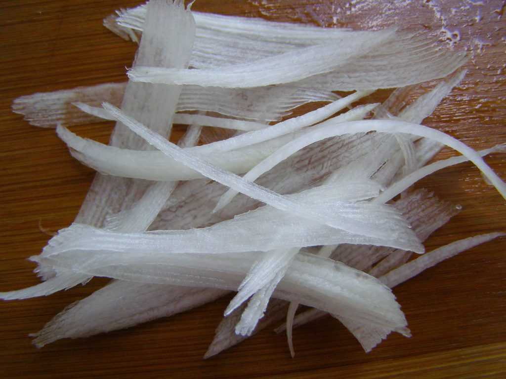 - Почистить две зеленые редьки и нарезать их тонкой соломкой.