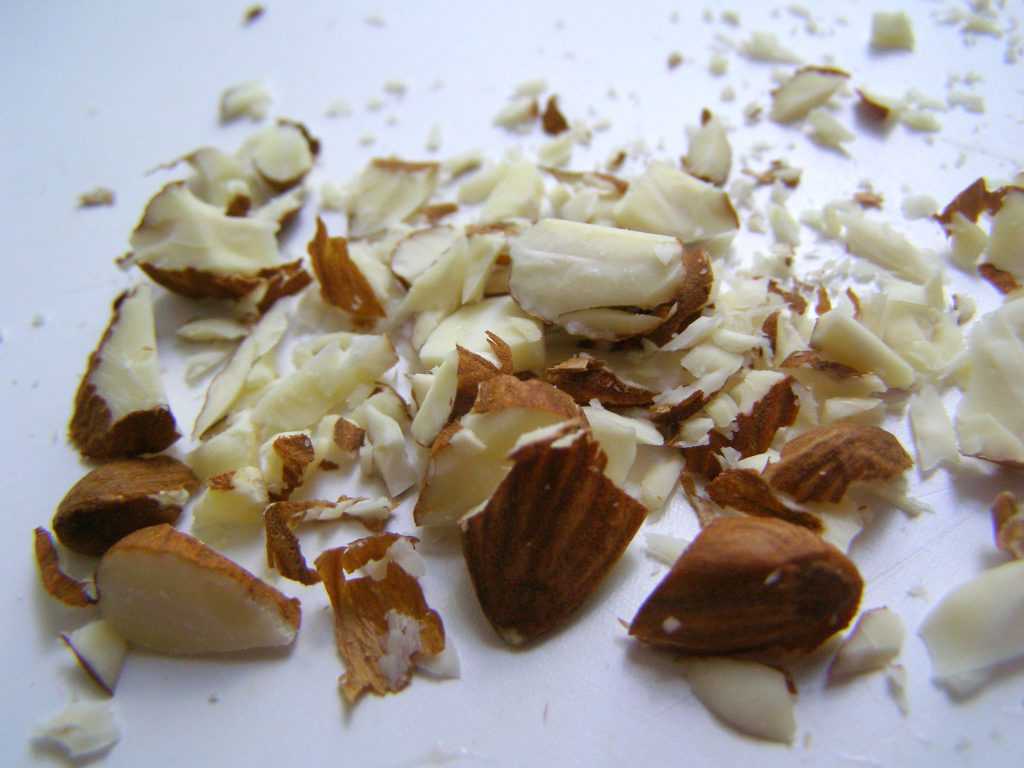 - Миндаль ошпарьте кипятком. Очистите от темной кожицы. Обжарьте ядра на сухой сковороде. Нарубите ножом на разделочной доске.